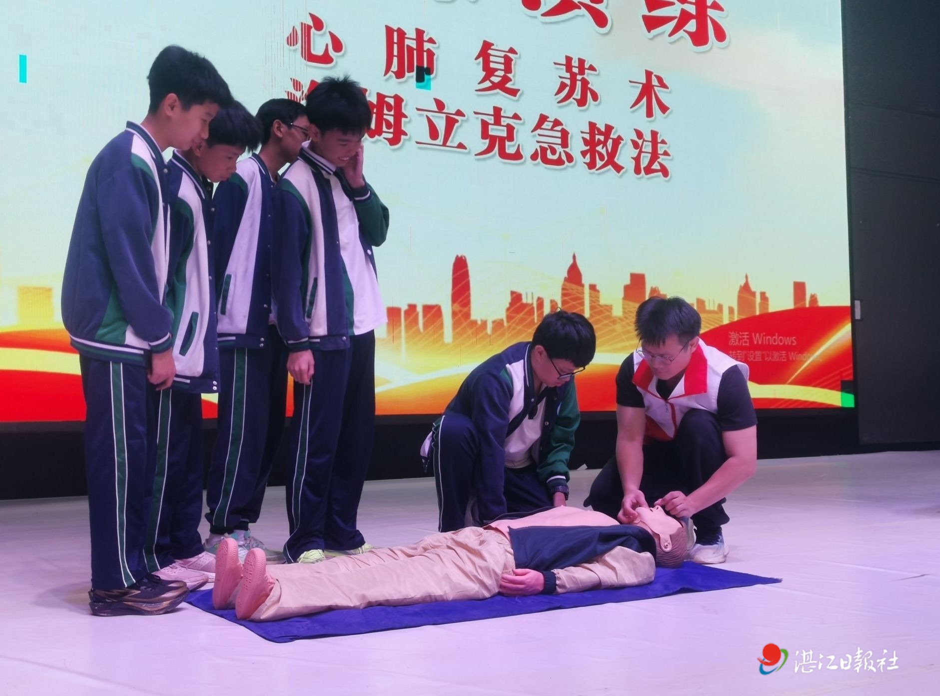 为巩固学习效果,活动设置了实操演练环节。广东医科大学附属医院徐闻医院示教团队现场演示了《海姆立克急救法》和《心肺复苏术操作》的标准流程。随后,15名师生代表在专家“一对一”手把手的指导下,上台进行了心肺复苏实操练习。在急救知识问答竞赛环节,师生们围绕所学内容踊跃抢答。