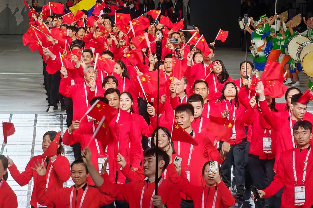 11月15日,中国体育代表团在第25届夏季听障奥运会开幕式上入场。新华社发(中国残联供图)