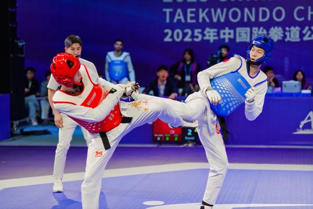2025年中国跆拳道公开赛中,代表中国队出战的湛江籍运动员、十五运会跆拳道冠军黄科奋(右一,穿蓝色护具者)夺得男子58公斤级金牌。(中国跆拳道协会官微截图)