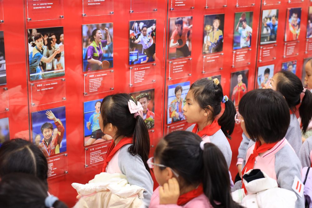中关村第三小学的学生们参观乒乓球馆内的“冠军荣誉墙”