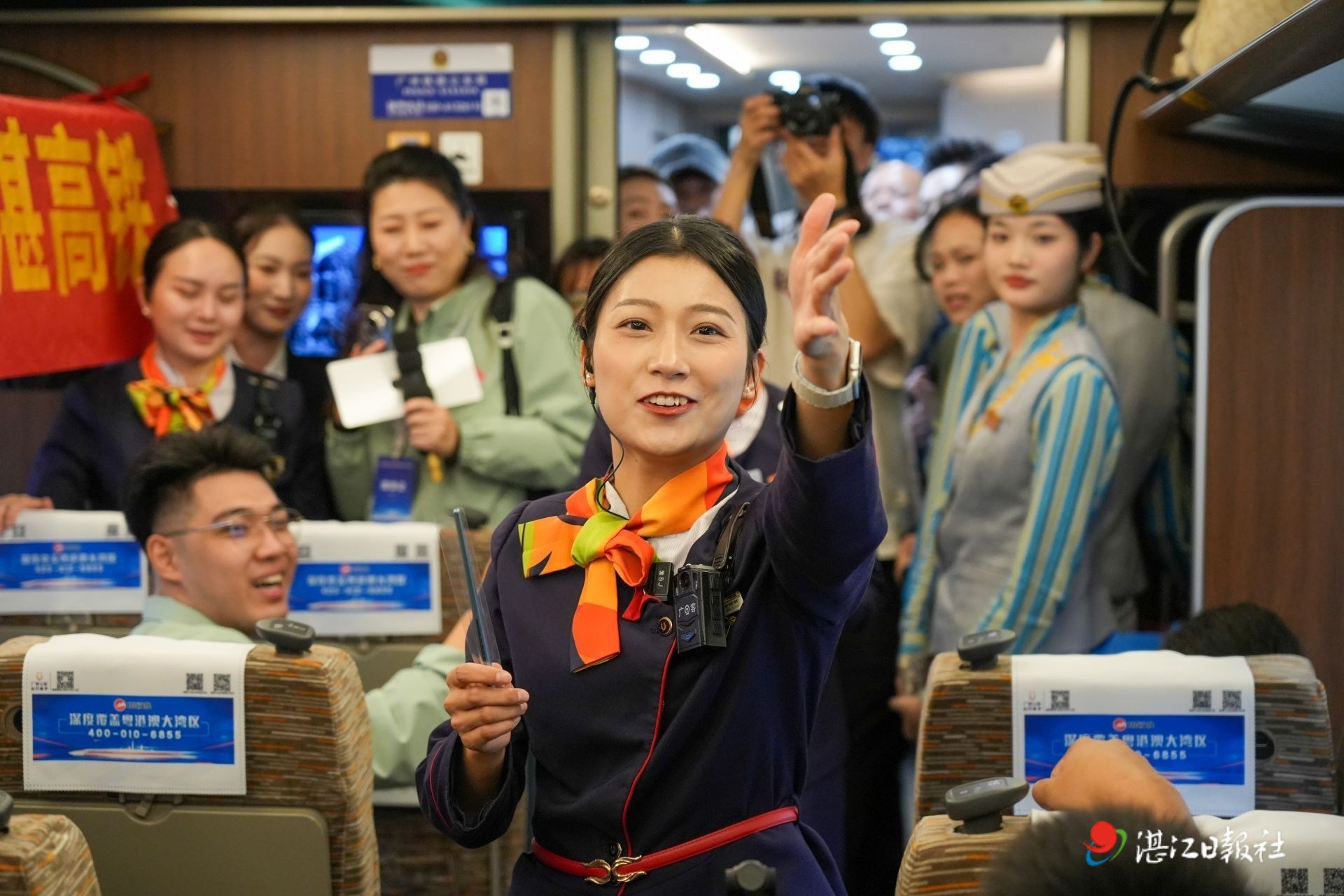 12月22日,广湛高铁通车,湛江北站至广州白云站首发列车上,乘务组为旅客举行互动小活动。 记者张锋锋 摄