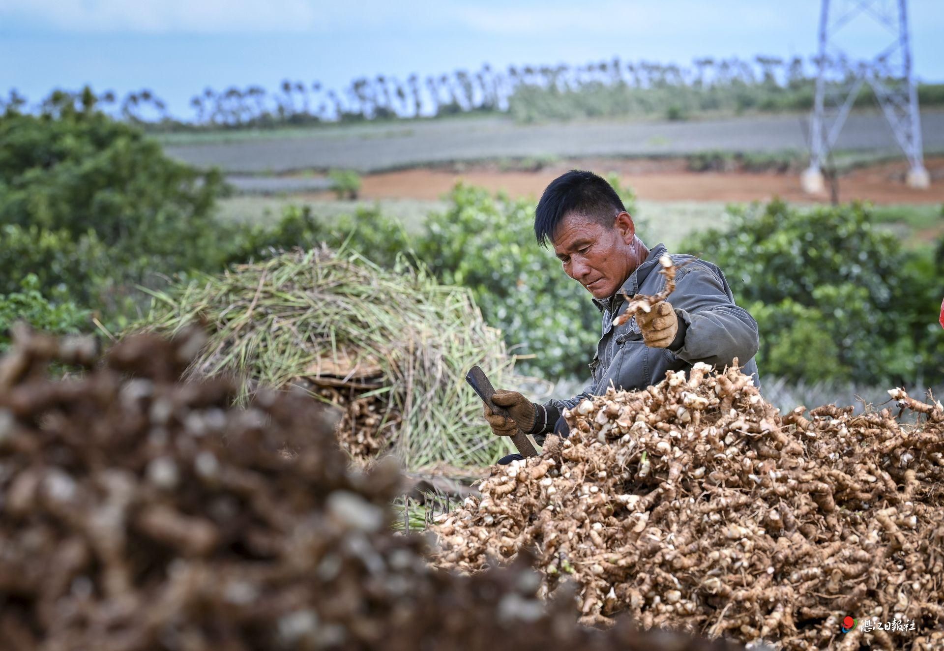 徐闻良姜地里,工人在清理良姜根须。