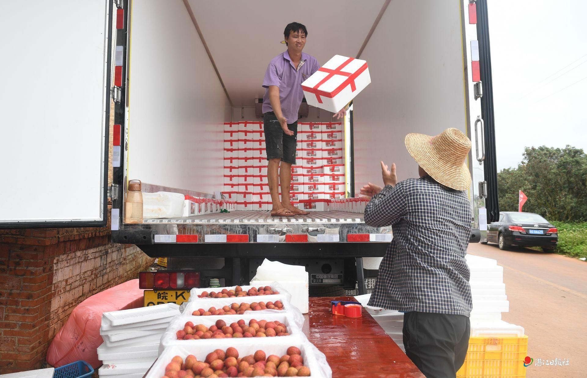 徐闻县迈陈镇荔枝收购点,工人将荔枝装入冷链车。