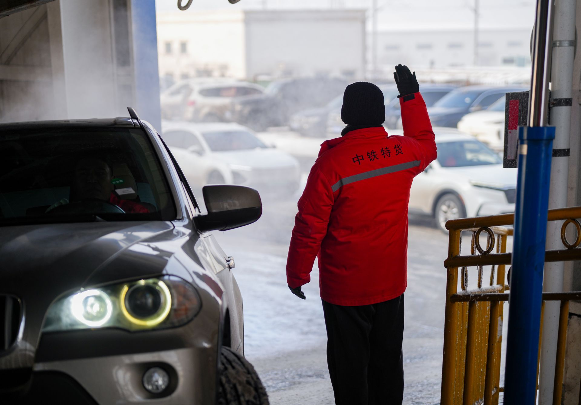 1月31日,在新疆乌鲁木齐中铁特货乌鲁木齐分公司三坪物流基地,工作人员指挥待托运车辆驶入列车。“现在托运汽车就像发快递一样方便!”春运临近,在新疆工作的黄先生通过铁路12306平台,为爱车购买了一张返回家乡四川的火车票。他用手机下单后,就有工作人员核验车辆信息、安检、托运。仅需四天,他的爱车和满满一车年货将被运输至目的地。黄先生说,与以往从新疆自驾回乡相比,铁路托运不仅方便实惠、不受天气条件限制,更重要的是自己和家人可以轻装上阵、轻松回家。与黄先生爱车共同搭乘这趟汽车托运专列的,共有290辆家用车。新华社记者 徐宏岩 摄