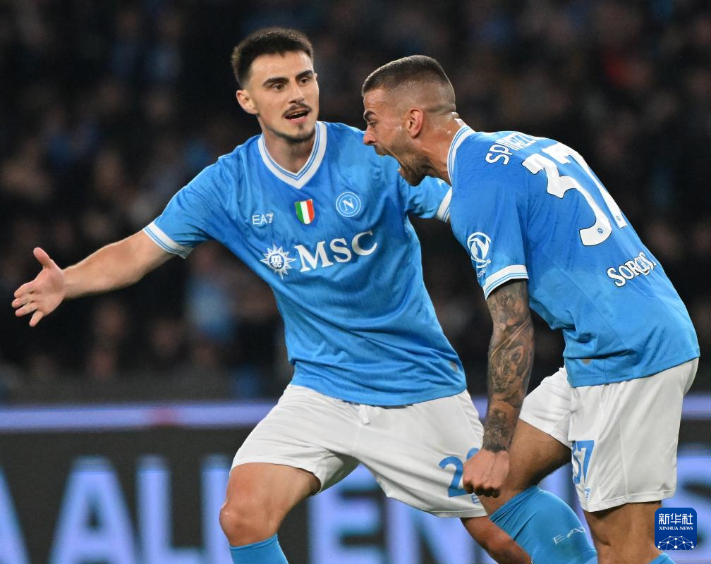 2月15日,那不勒斯队球员斯皮纳佐拉(右)庆祝进球。