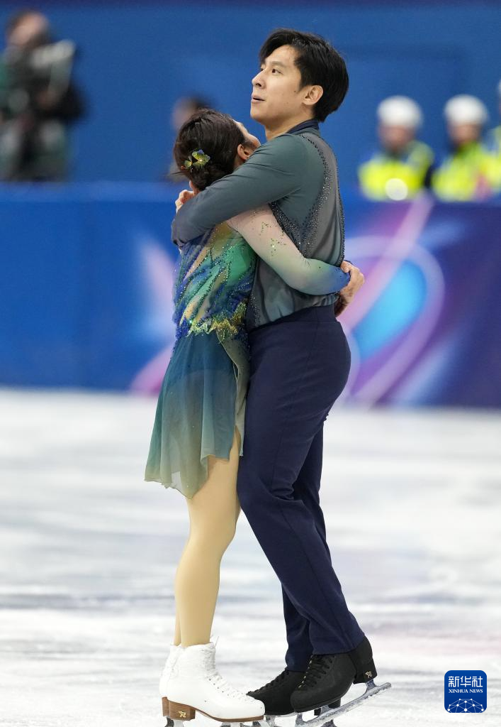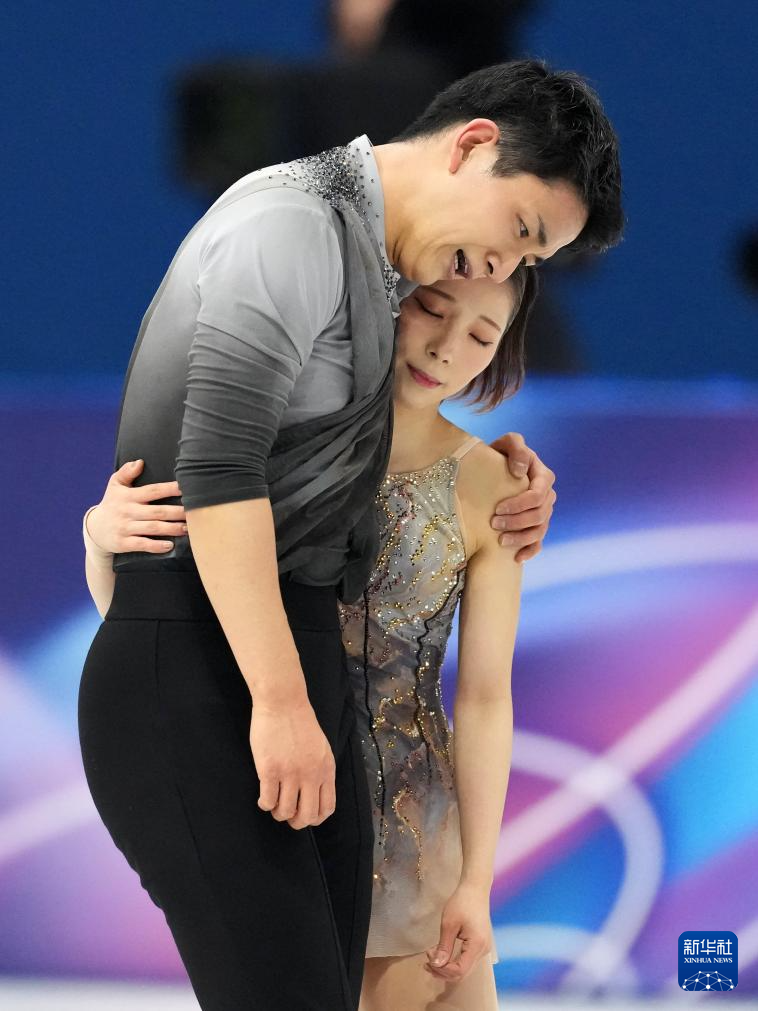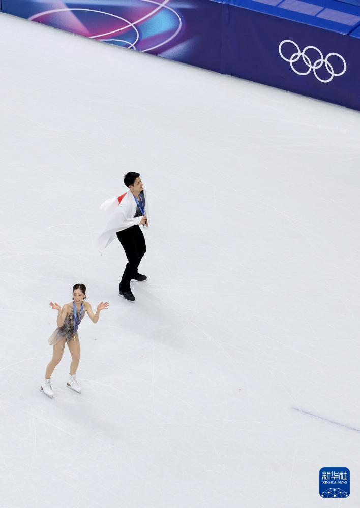 2月16日,日本组合三浦璃来(右)/木原龙一在双人滑自由滑比赛后。最终他们获得双人滑项目冠军。
