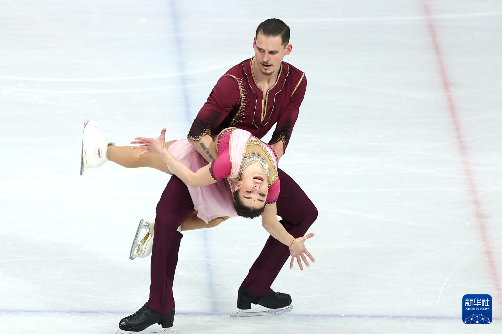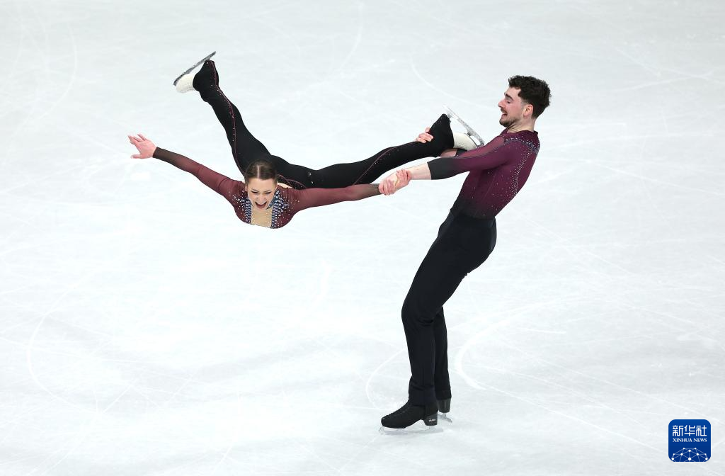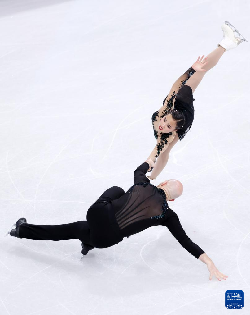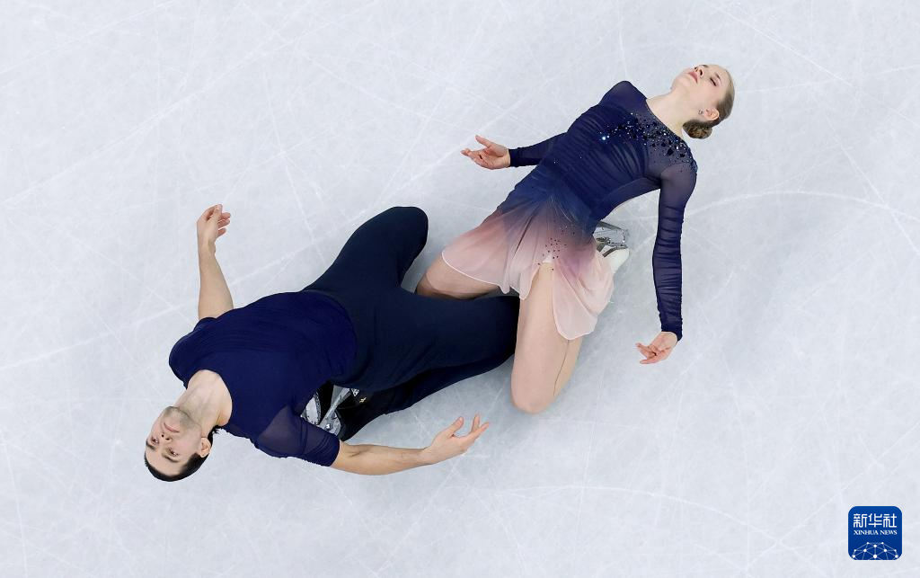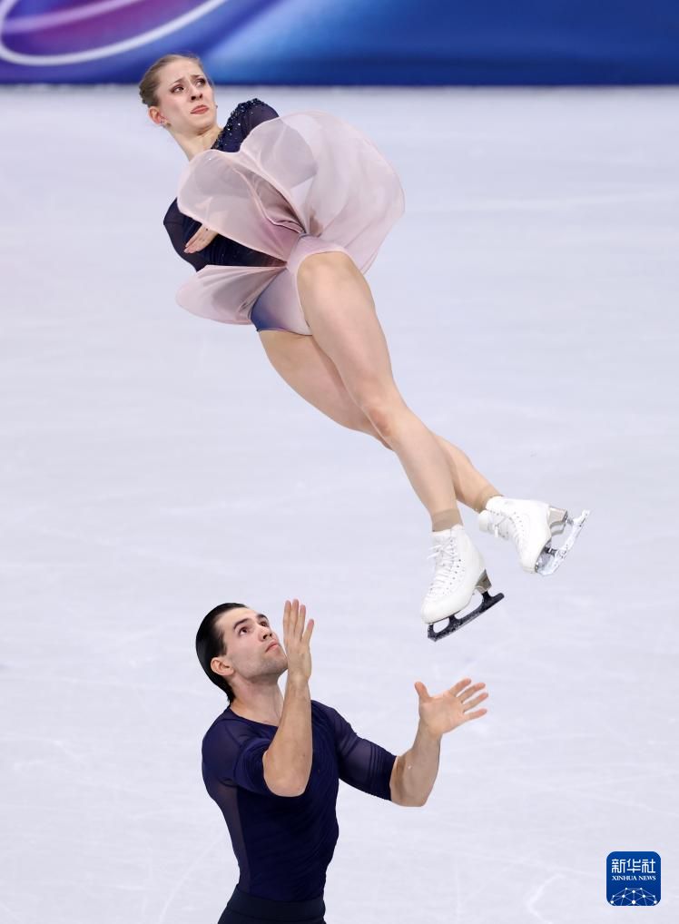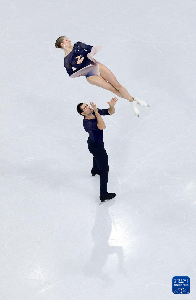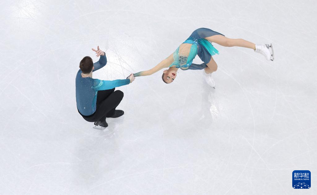 2月16日,德国组合哈泽(上)/沃洛丁在比赛中。他们获得双人滑项目季军。