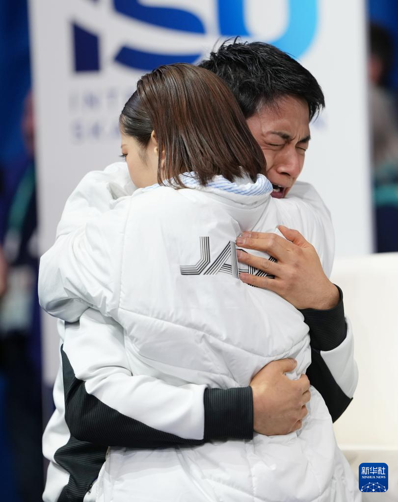 2月16日,日本组合三浦璃来(右)/木原龙一在得知他们的双人滑自由滑成绩后激动不已。最终他们获得双人滑项目冠军。