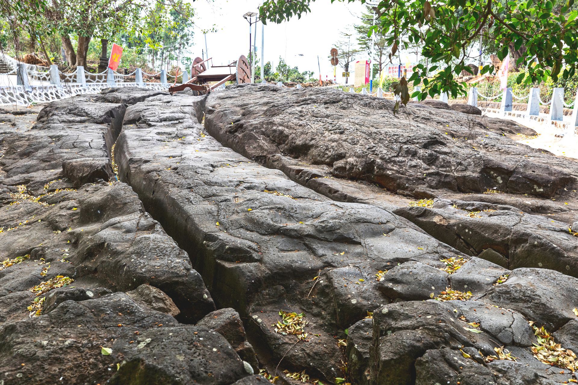 我们不是考古专家,仅凭借自己有限的认知去推断古道承载这个重任的原因。我想,雷州半岛在很久以前密林遍布,且多雨。半岛的土地是红土,红土地一旦遭遇雨水的浇淋,红泥黏性就变得很强,载有重物的牛车若在大雨后的红泥地上经过,几乎是寸步难行,在这样的地理气候条件下,高脚牛车是这片红土地上最主要的交通工具,这一大片玄武岩石理所当然地成为人们选择的交通要道,古道就开始了它迎来送往的使命。