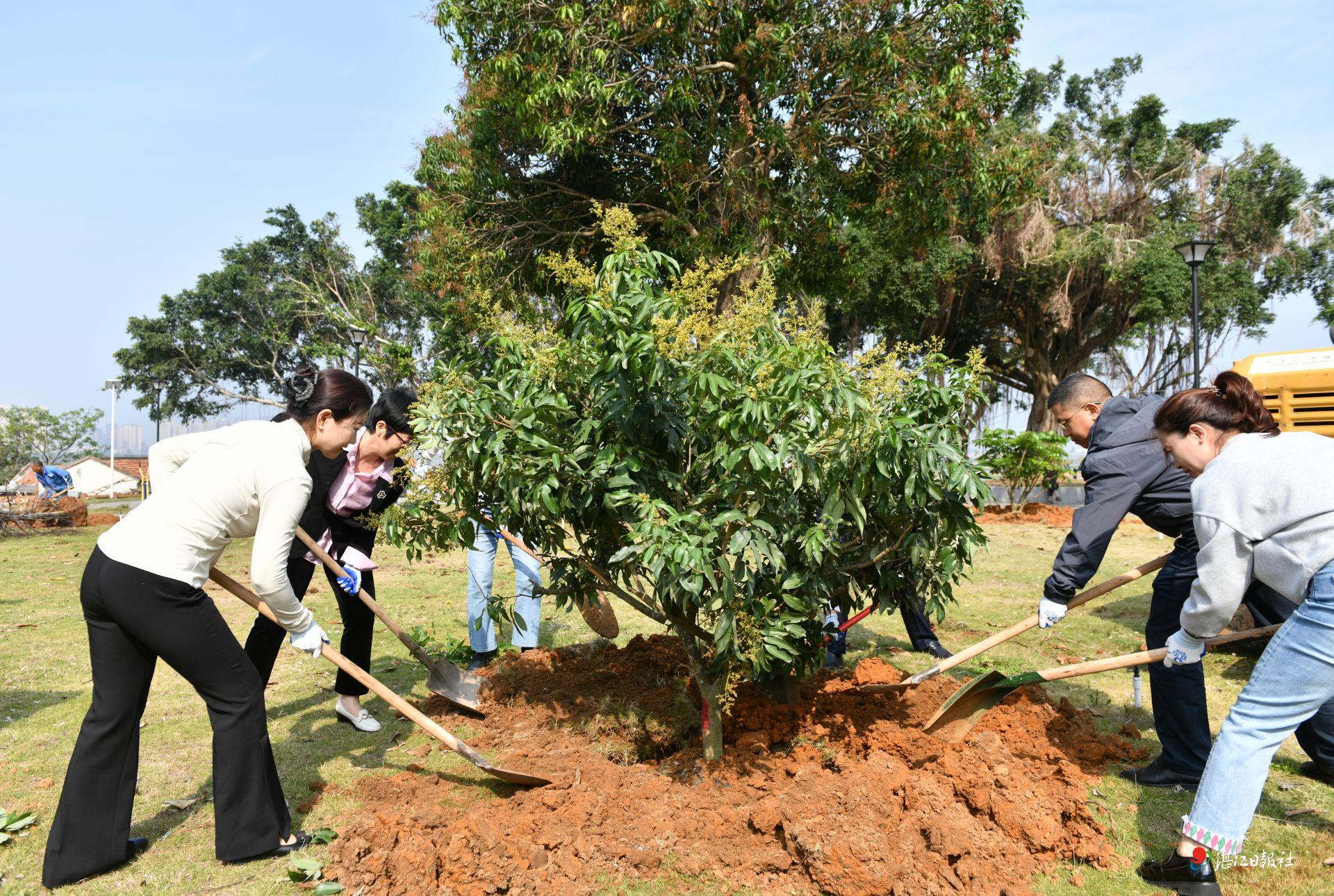 现场的干部职工们热情高涨、分工协作,扶苗、培土、踩实,每一个步骤都细致认真。大家手持铁锹躬身劳作,默契十足,20余棵荔枝、龙眼、秋枫树苗稳稳扎根沃土。春日的暖阳下,巾帼红与生态绿相映成趣,成为公园中最动人的画面。