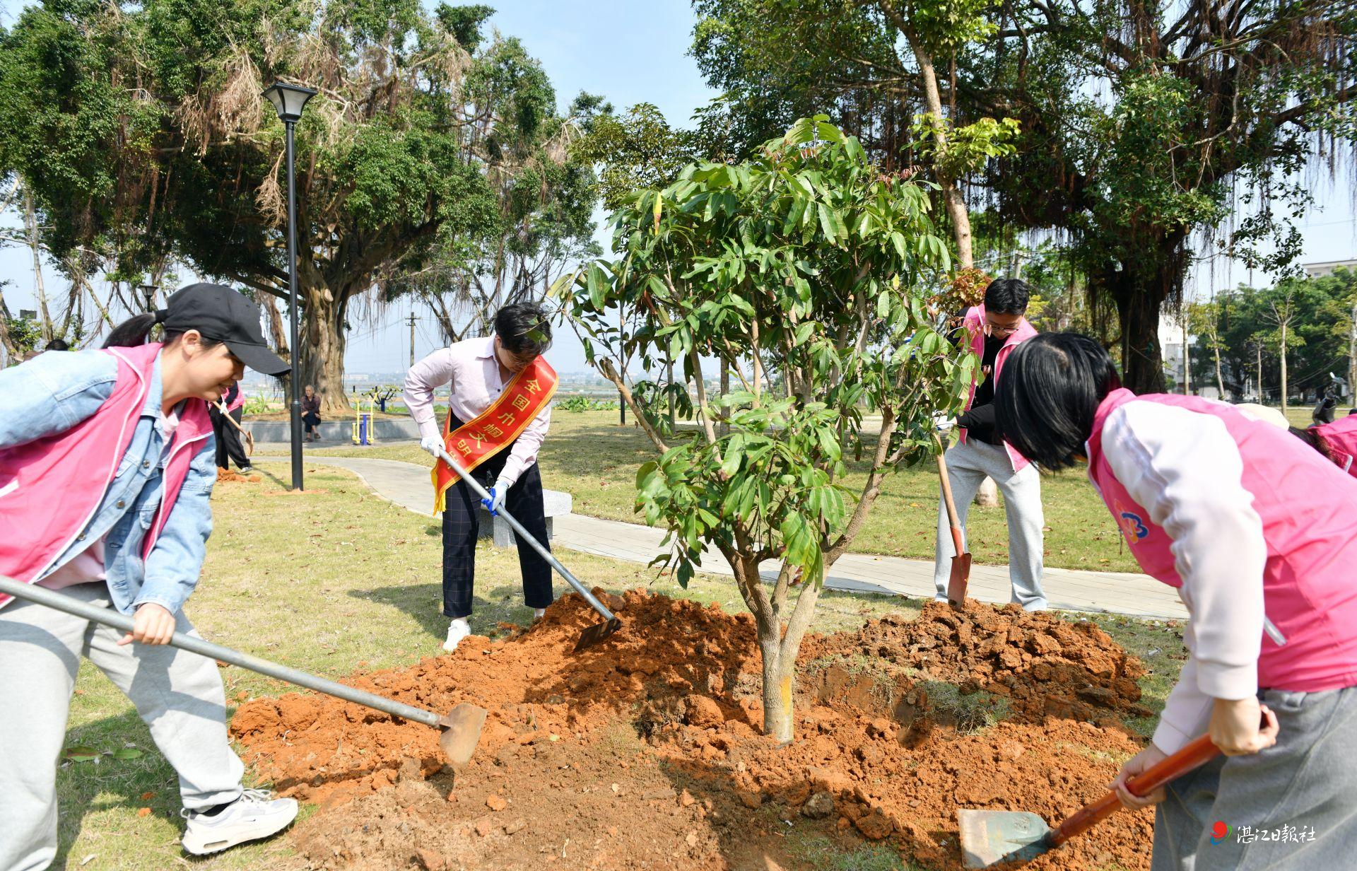 春风送暖,植绿正当时。3月12日植树节当天,湛江市调顺街道调顺村口袋公园内一片热火朝天的景象,由湛江市妇联举办的“同植幸福树 共建绿美家”植树活动在此开幕。市妇联及市妇儿中心干部职工、2025年度全国巾帼先进代表、赤坎区妇联与调顺街道领导干部、湛江市妇女儿童发展促进会代表等约50人齐聚一堂,以植绿护绿的实际行动,为绿美湛江建设增砖添瓦。