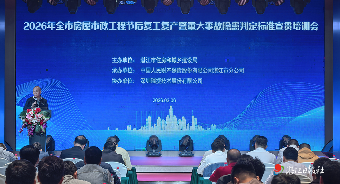 为扎实推进我市房屋市政工程节后复工复产各项工作,深入宣贯《房屋市政工程生产安全重大事故隐患判定标准(2024 版)》,进一步夯实行业安全生产基础,普及安全生产责任保险政策,提升从业人员安全生产管理能力和企业安全风险防范水平,近日,2026年全市房屋市政工程节后复工复产暨重大事故隐患判定标准培训会顺利召开。本次会议由湛江市住房和城乡建设局主办,人保财险湛江市分公司承办,全市住建系统相关负责人、企业代表及协会代表等400余人参加。