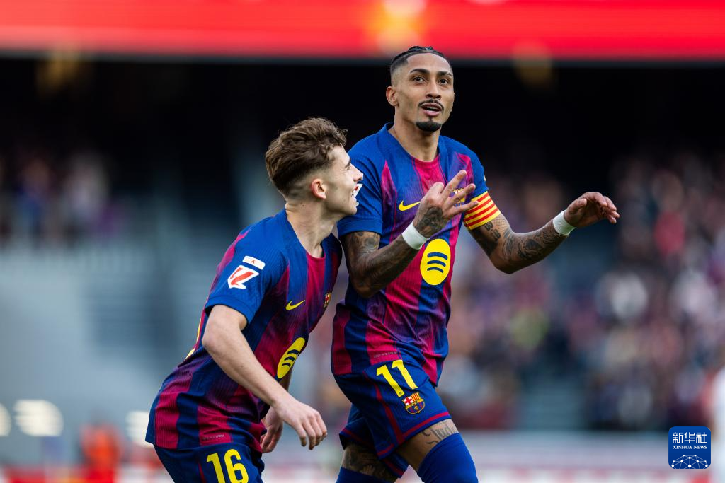 3月15日,巴塞罗那队球员拉菲尼亚(右)庆祝个人本场第三个进球。