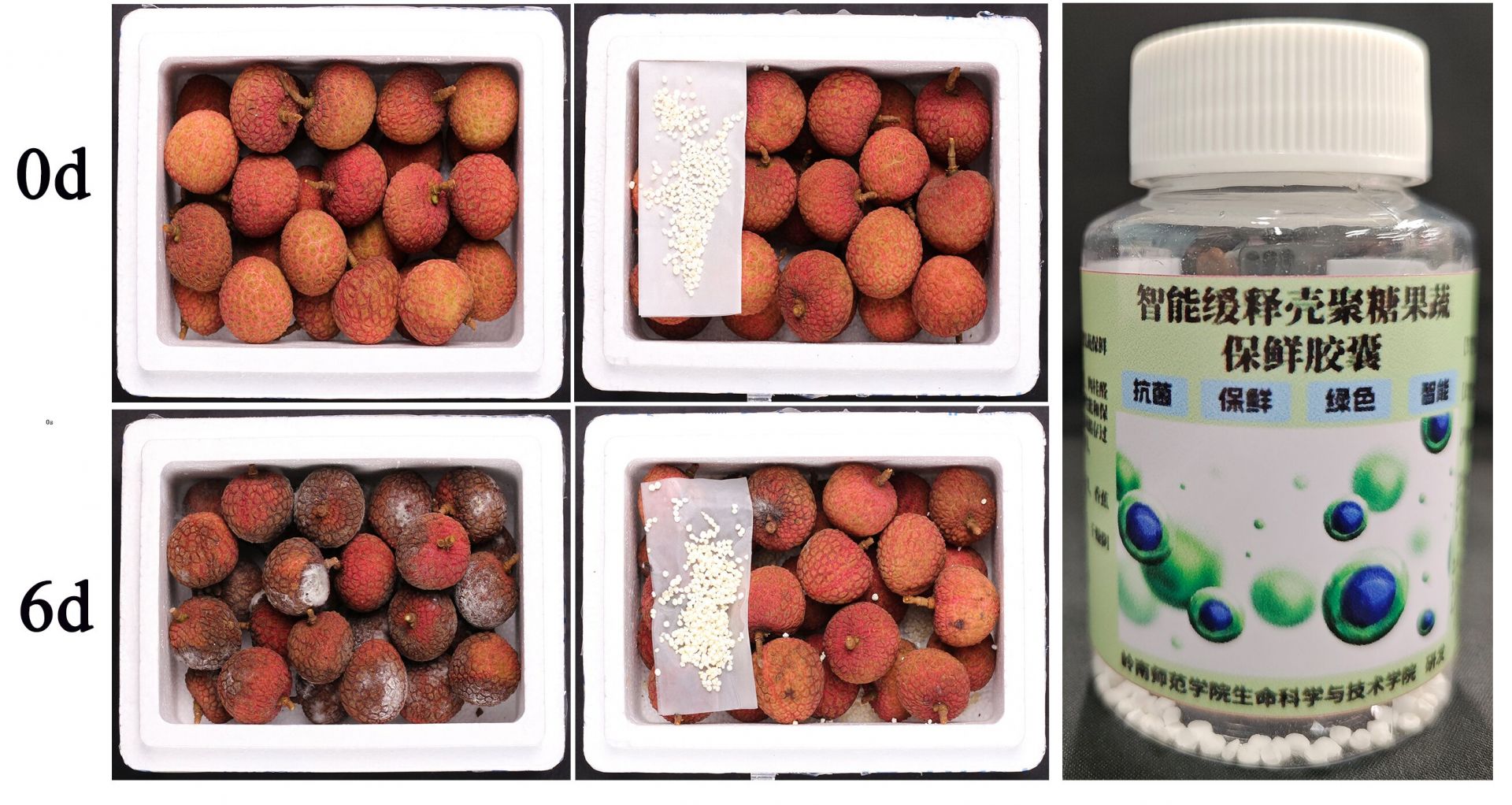 在保鲜应用展示区,几张实验照片引起了记者的注意。照片中,经过壳聚糖涂膜处理的番木瓜在25℃贮藏条件下,采后成熟时间可延迟至16天。旁边另一组对比图中,几颗荔枝在常温下摆放了6天,依然色泽鲜红、果皮饱满,而对照组中未经处理的荔枝早已褐变腐烂。