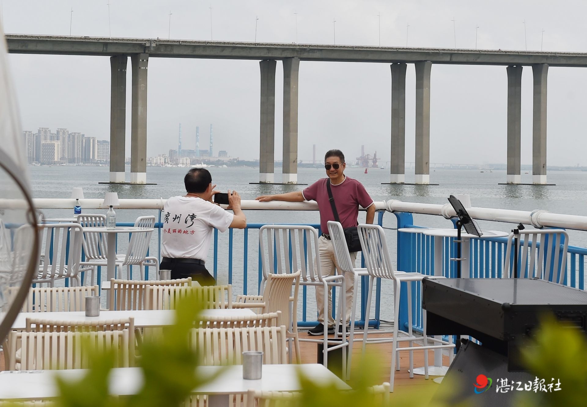 3月25日上午,阳光明媚,在广州湾大道海豚湾观海长廊,不少市民、游人趁着好天气来到海边玩耍拍照。人们或漫步听涛,或驻足拍照,尽情享受惬意时光。记者镜头捕捉到温馨一幕:一位身着印有“广州湾一个美丽的地方”字样T恤的市民,正专注地为同伴定格海边笑脸。