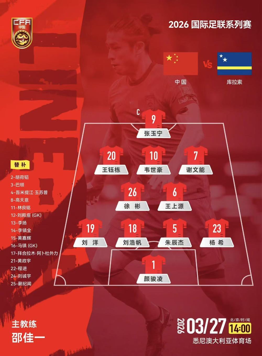 新华社悉尼3月27日电 在27日进行的国际足联系列赛中,韦世豪、张玉宁各入一球,帮助中国男足国家队以2:0战胜库拉索队。本场比赛是新任中国男足主教练邵佳一带队的首场正式比赛。