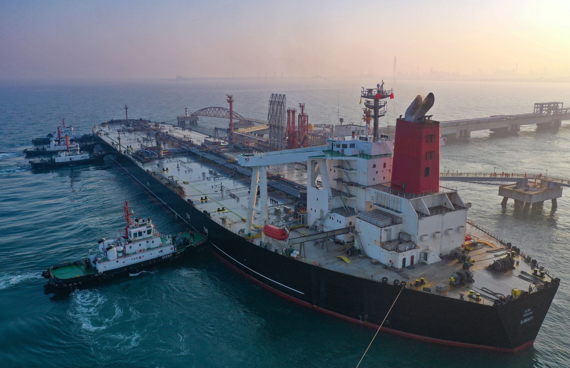 2025年12月18日,一艘装载着17.9万吨石化原辅料的船舶泊入国投洋浦油储码头30万吨级原油泊位(无人机照片)。这是海南自由贸易港正式启动全岛封关后洋浦港口岸第一批通关的“零关税”石化原辅料。新华社记者郭程 摄