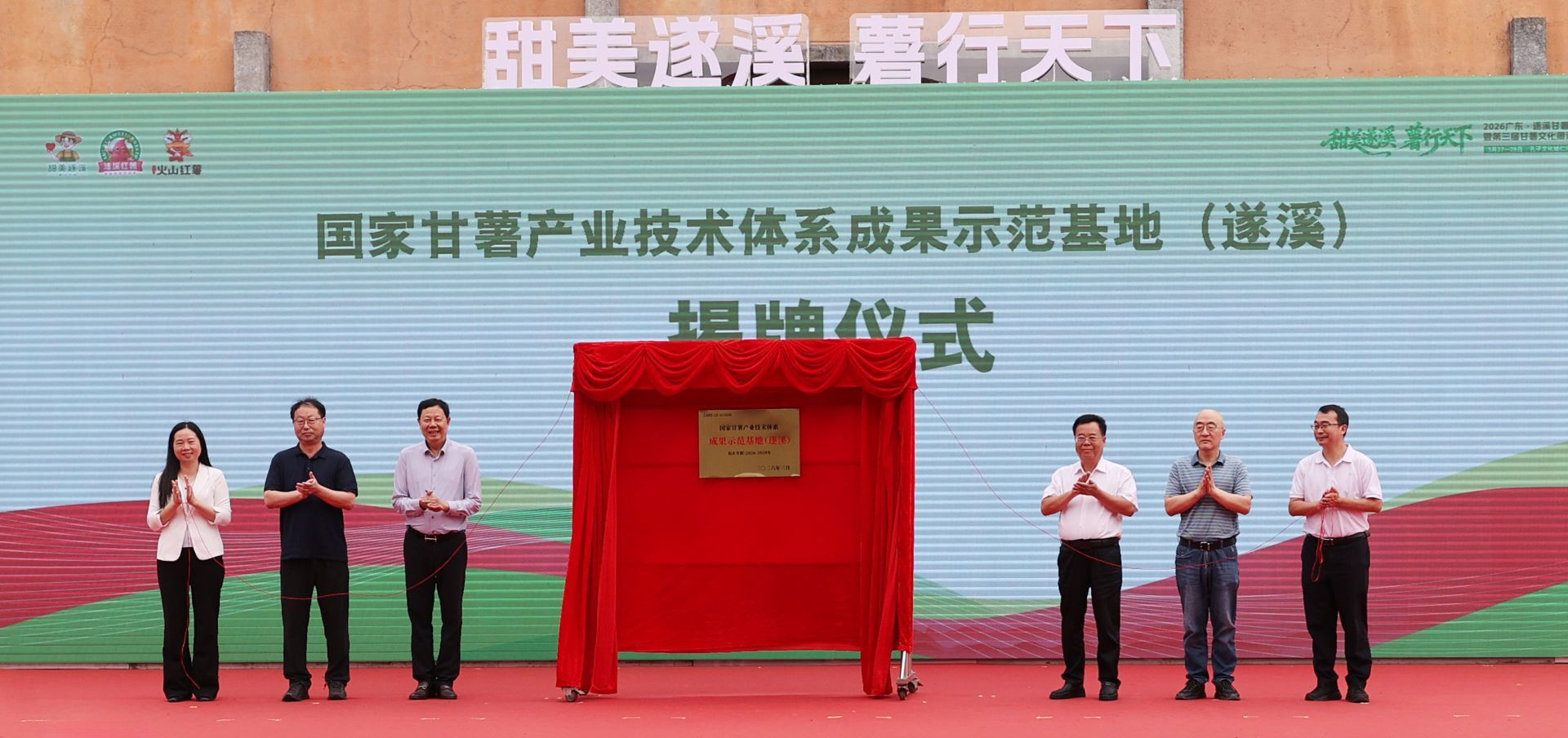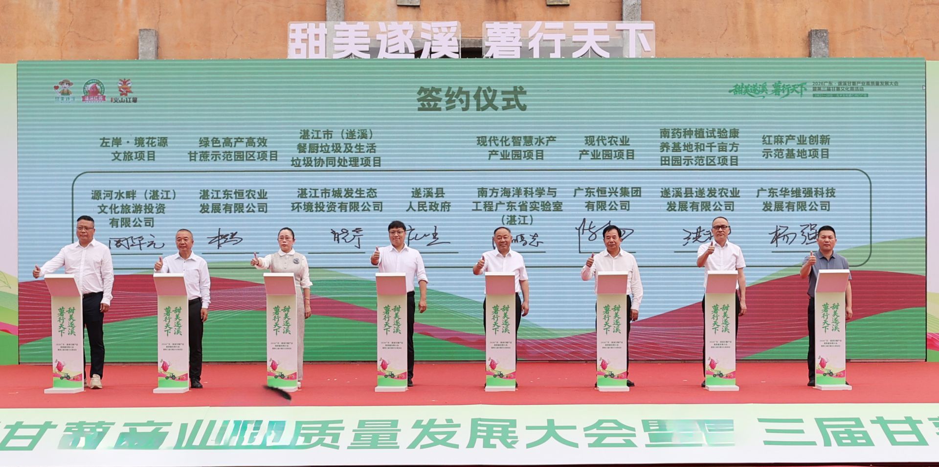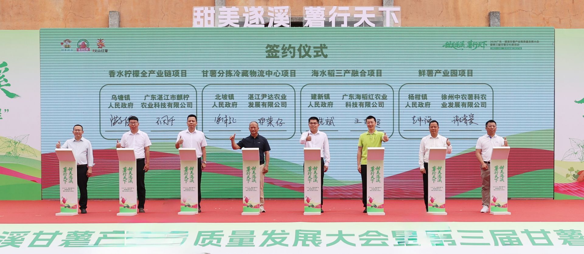 活动现场,遂溪县政府与广东省科学院南繁种业研究所湛江研究中心等科研院所举行签约仪式,双方将在优质种苗研发、科技成果转化、产业技术升级等方面开展深度合作;“遂溪县甘薯产业发展研究中心”“国家甘薯产业技术体系成果示范基地(遂溪)”同步揭牌,打通科技成果转化“最后一公里”,为遂溪甘薯产业高质量发展搭建起高水平科研创新平台。