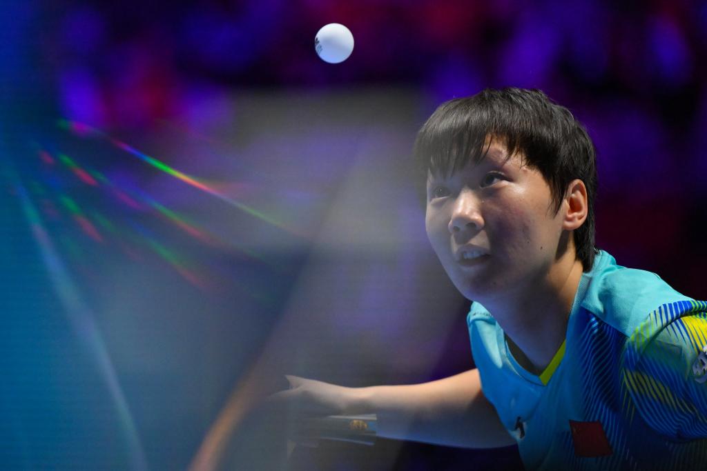 4月2日,中国选手孙颖莎在比赛中回球。新华社发(张金加摄)