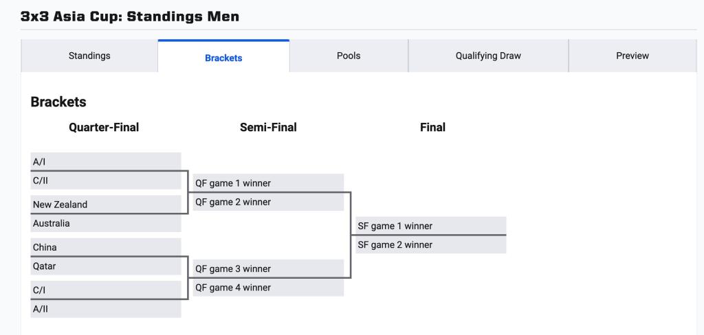 淘汰赛对阵,中国男队将在四分之一决赛中对阵卡塔尔队。图片来自国际篮联三人篮球官网