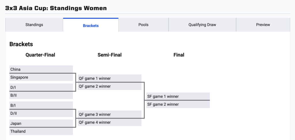 淘汰赛对阵,中国女队将在四分之一决赛中对阵新加坡队。图片来自国际篮联三人篮球官网