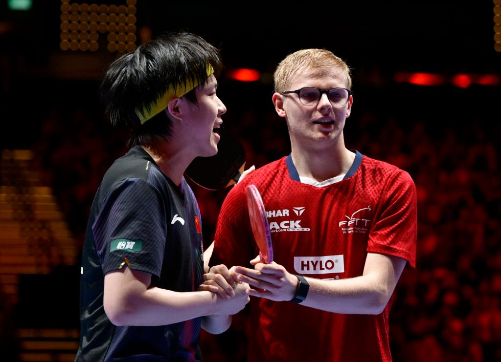 4月3日,王楚钦(左)与费利克斯·勒布伦赛后握手。新华社记者 于洋 摄