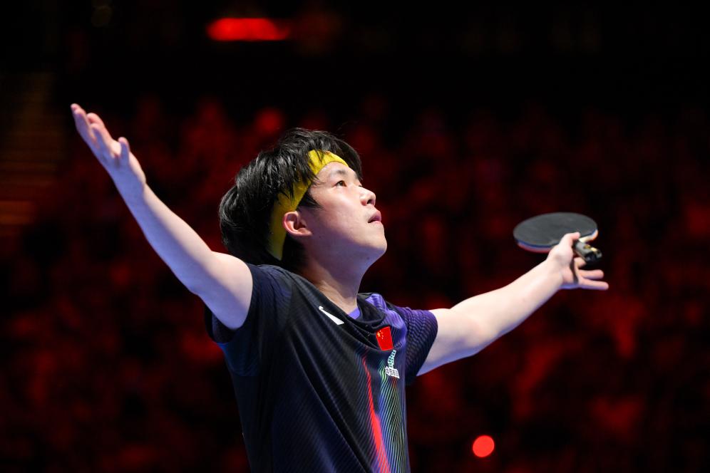 4月3日,王楚钦庆祝胜利。新华社发(张金加 摄)