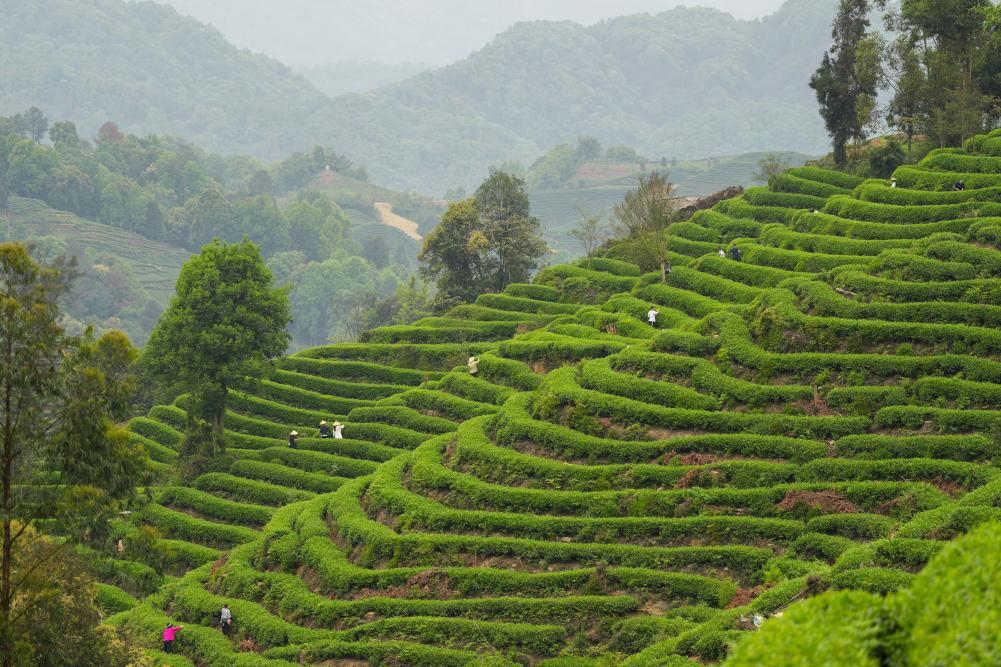 4月5日,人们在四川省雅安市牛碾坪万亩观光茶园体验采茶。新华社记者 胥冰洁 摄