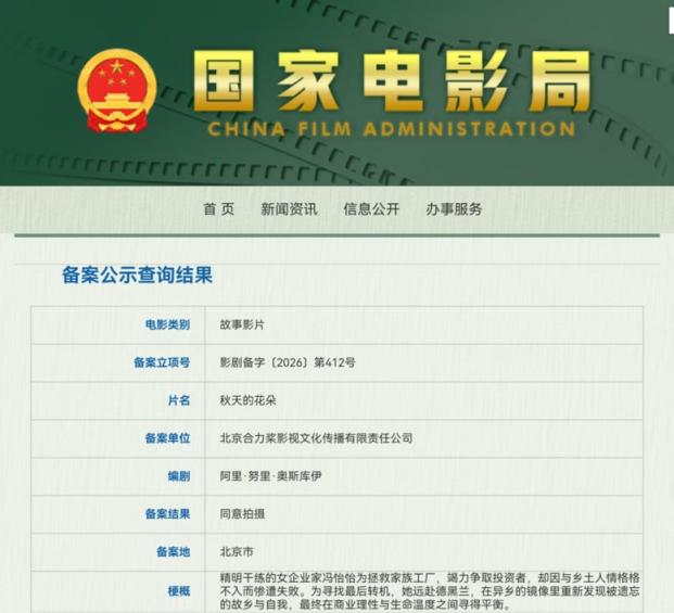 近日,国家电影局官网公示显示,中国与伊朗联合制片的电影《秋天的花朵》正式获得拍摄备案许可,备案立项号为影剧备字〔2026〕第412号,这一消息标志着这部承载中伊人文交流使命的影片,正式迈入实质性筹备阶段。