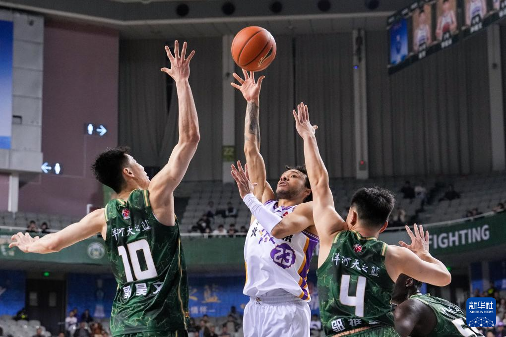 4月8日,北京控股队球员豪斯(中)在比赛中投篮。