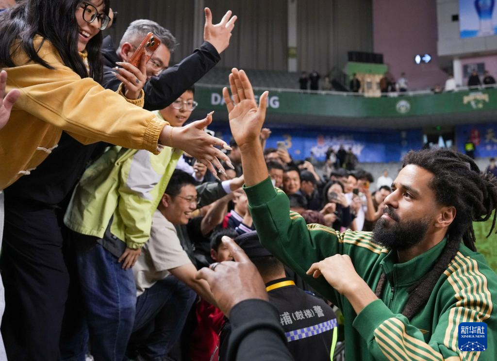 4月8日,跨界加盟南京同曦俱乐部的美国说唱歌手杰曼·拉马尔·科尔(右一)赛后与球迷互动。