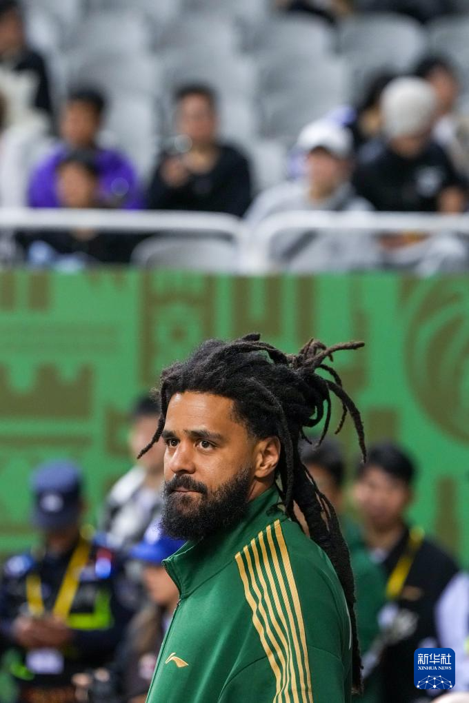 4月8日,跨界加盟南京同曦俱乐部的美国说唱歌手杰曼·拉马尔·科尔在场边观赛。