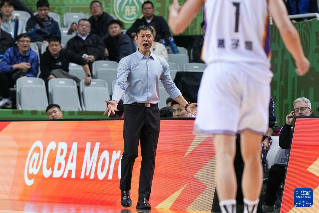 4月8日,北京控股队主教练张庆鹏在场边指挥。
