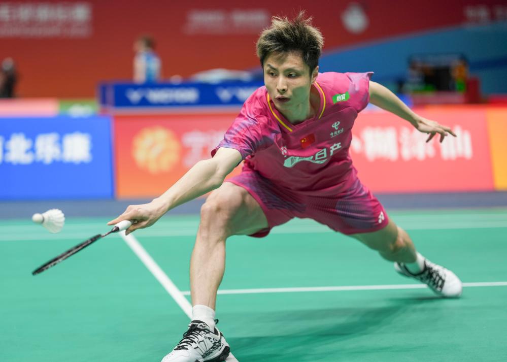 4月9日,石宇奇在比赛中回球。新华社记者 孙非 摄