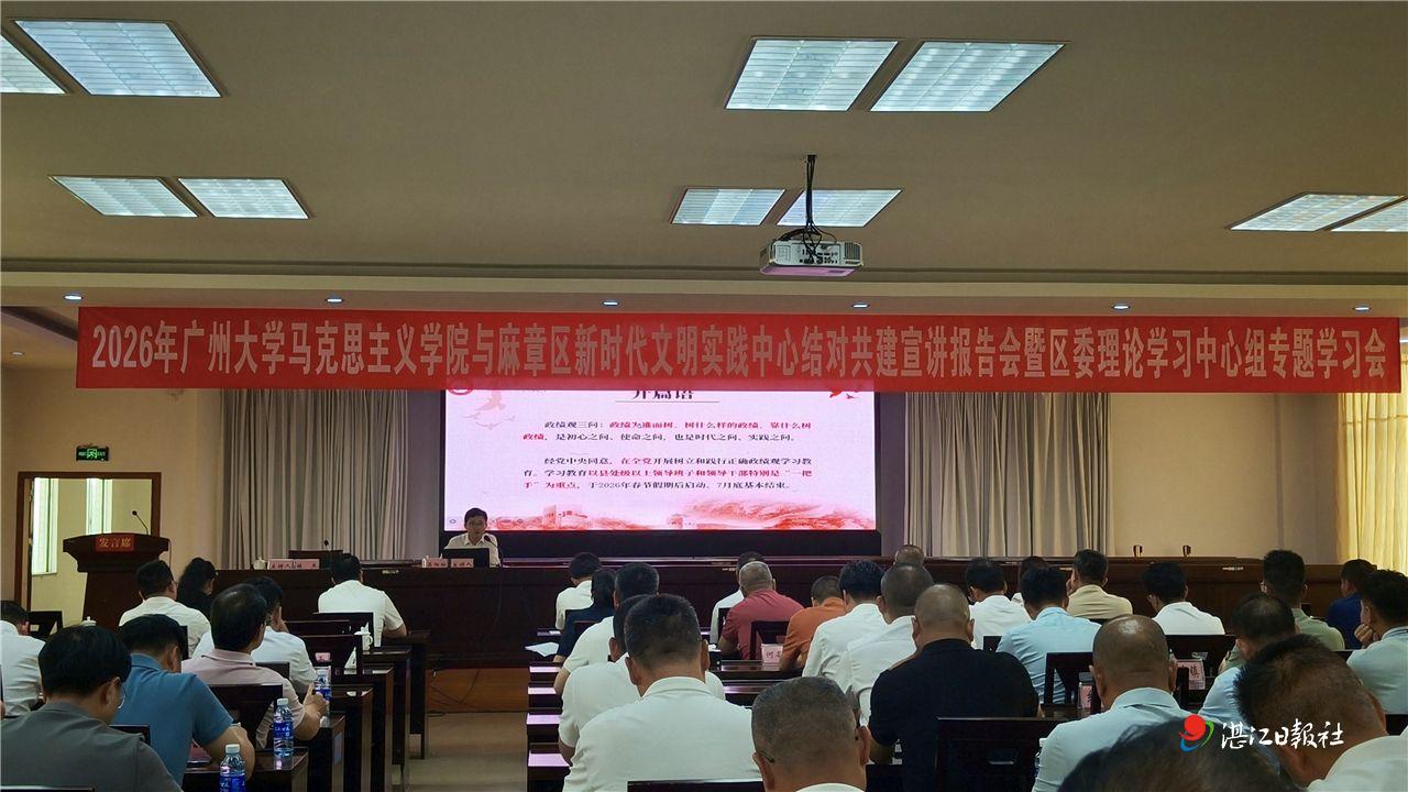 4月10日下午,2026年广州大学马克思主义学院与麻章区新时代文明实践中心结对共建宣讲报告会暨区委理论学习中心组专题学习会在麻章区机关办公楼召开。会议聚焦树立和践行正确政绩观,引导全区党员干部坚持实事求是、求真务实,以实干担当推动麻章高质量发展。