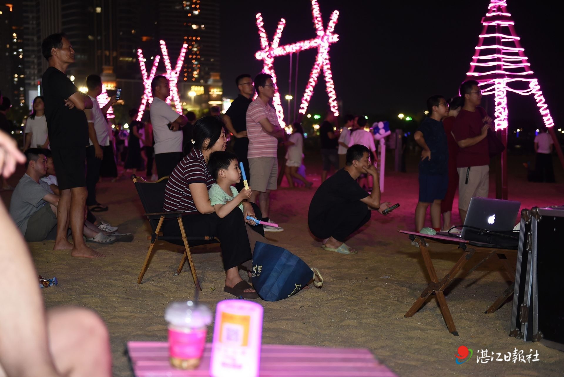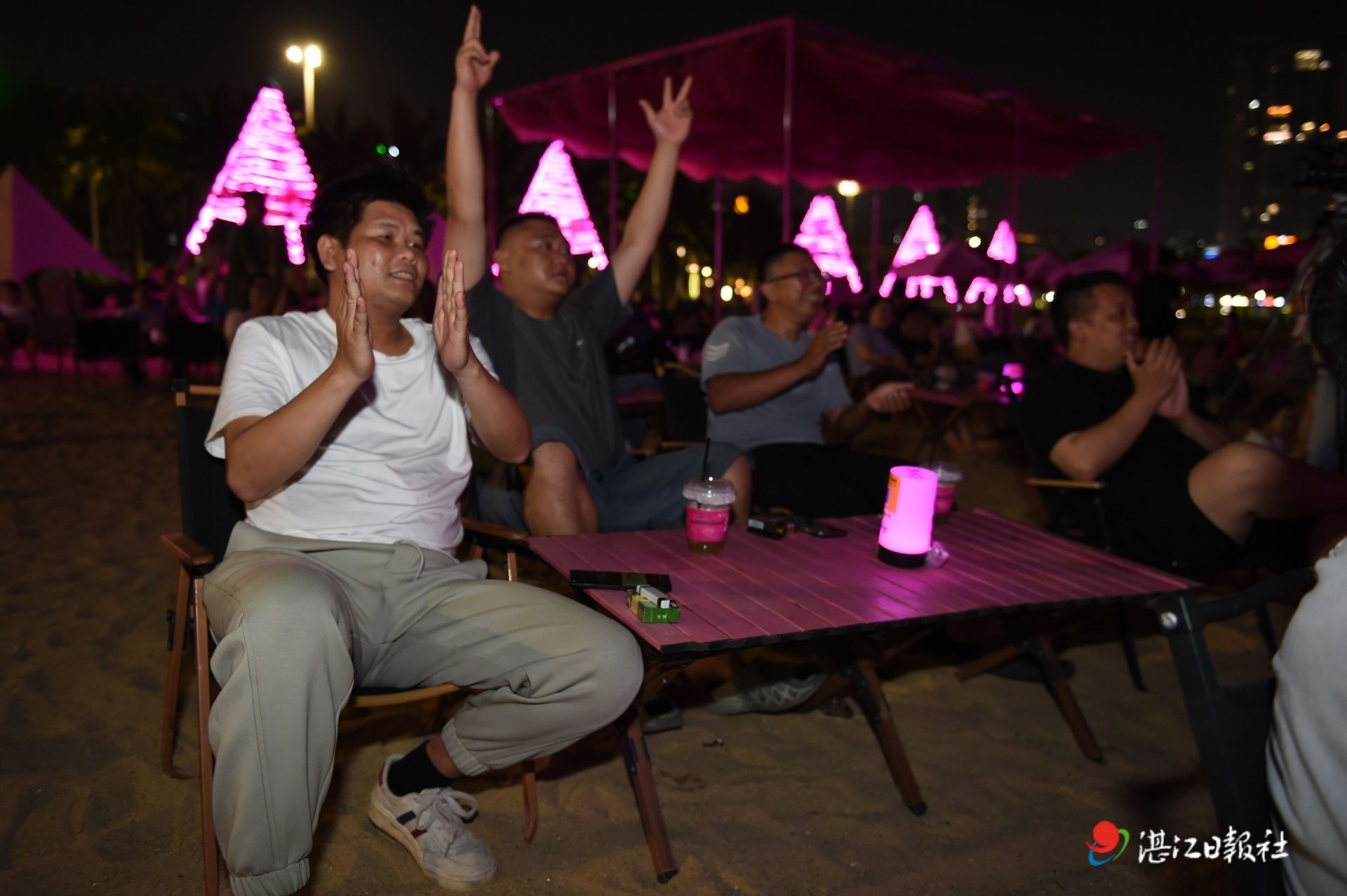 夜幕下的金沙湾,紫色氛围灯与巨型“湛江”热气球造型灯交相辉映,将沙滩映照得格外浪漫。球迷们不拘一格,有人围坐在露营椅上,有人席地而坐,还有人站立观战,大家目光紧紧锁定户外大屏,生怕错过赛场每一个精彩瞬间。每当湛江队发起进攻、完成抢断,或是投中篮板,现场便会响起不约而同的欢呼声,“好球”“湛江加油”呐喊声此起彼伏,将观赛氛围一次次推向高潮。