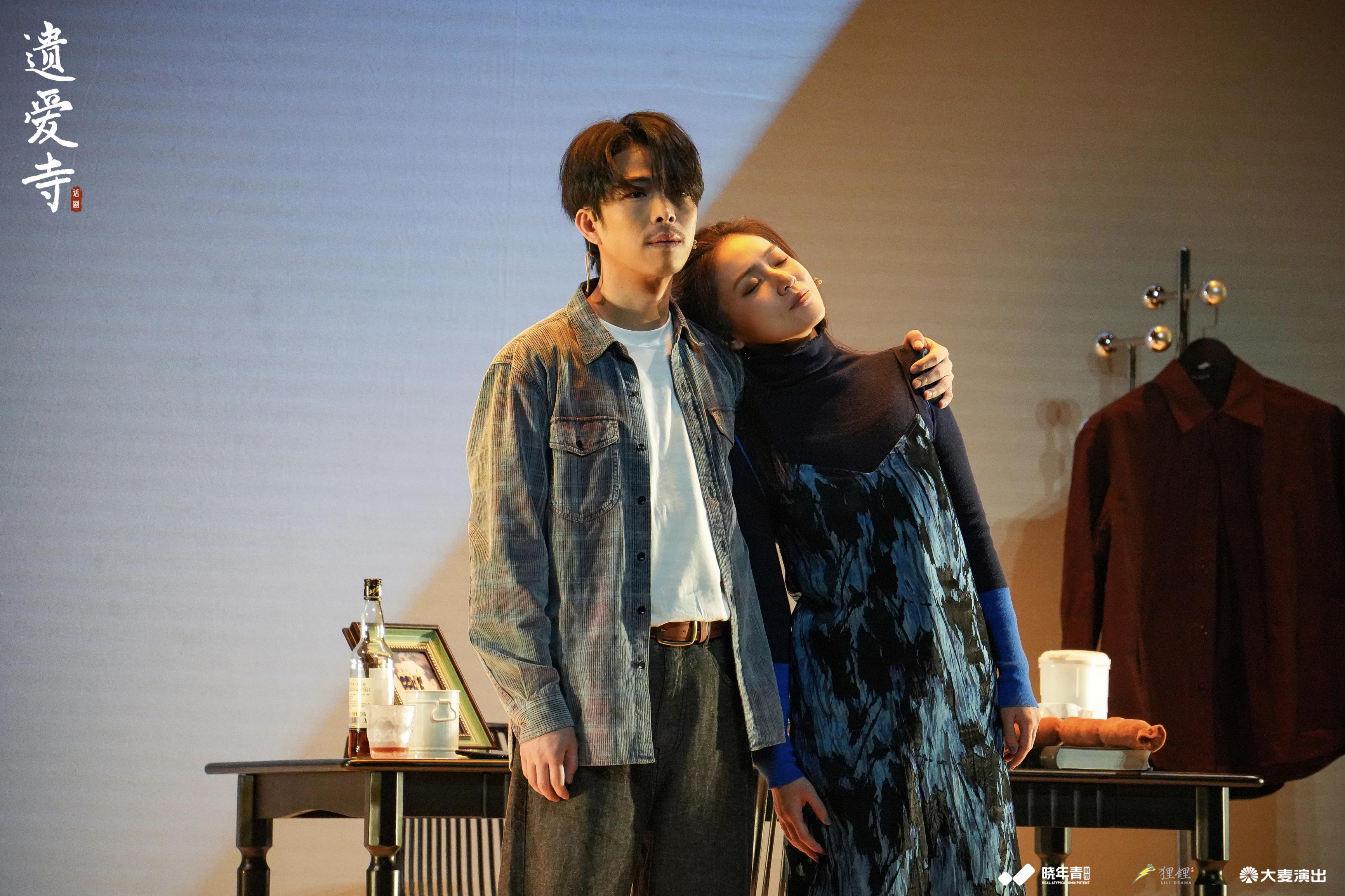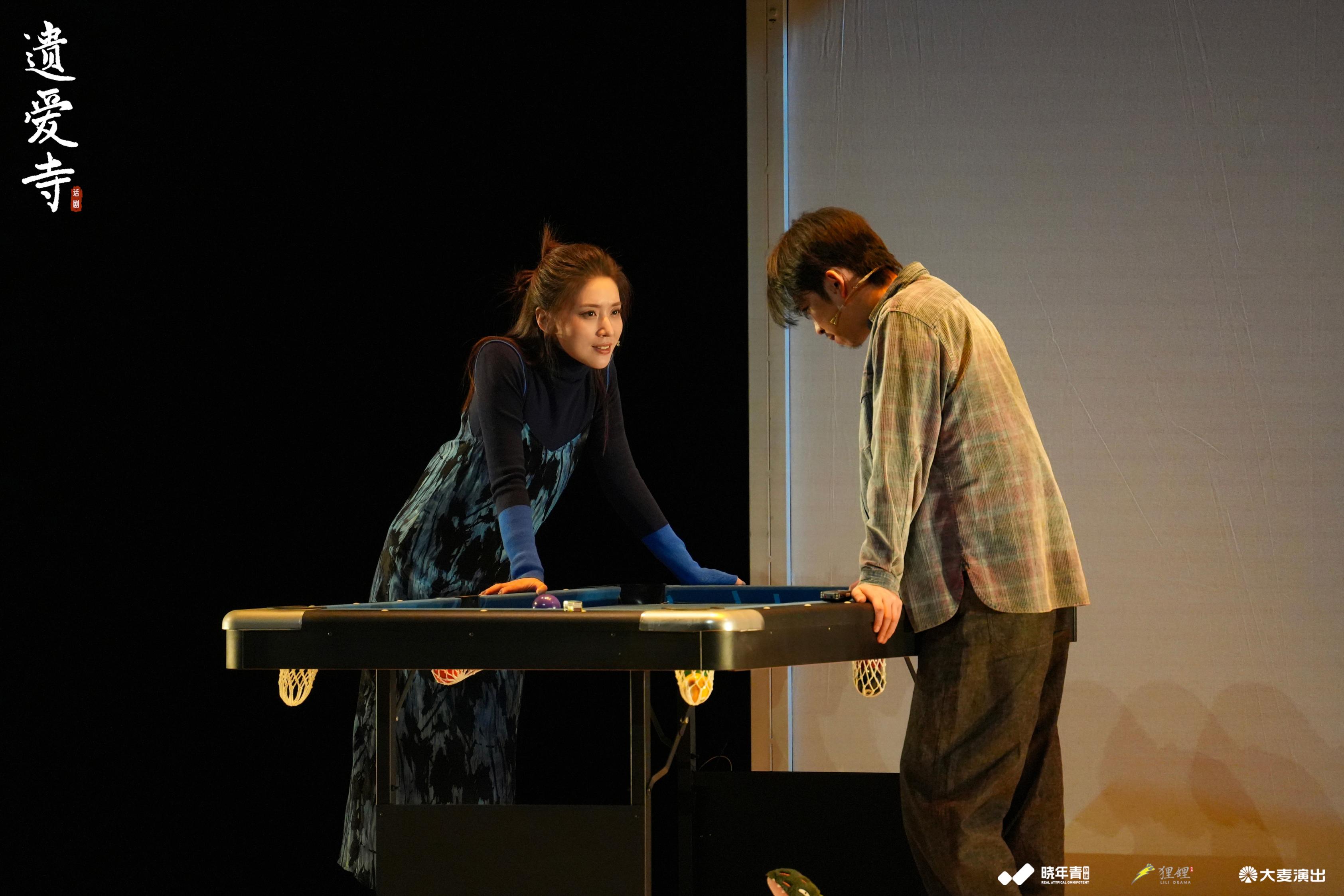 从舞台呈现来看,《遗爱寺》的美学格调克制简约而富有巧思,色彩上以白与红为主——两种颜色分别呼应着剧作的两大主题:爱与遗失。一个可旋转的双面舞台,在转动之间便构建出全剧所有核心场景:司马英的诊室、李兵与司马英的家、尼娜的房间,以及见证一切的“遗爱寺”。一块白色电子屏矗立其间,记忆里模糊的影像在屏上浮现,又在暗场后归于空白,仿佛从未真实存在,不过是记忆偶尔投射出的几帧残影。当一切尘埃落定,“遗爱寺”三个字被一块红色幕布彻底覆盖,如同一座铭刻着爱的墓碑。