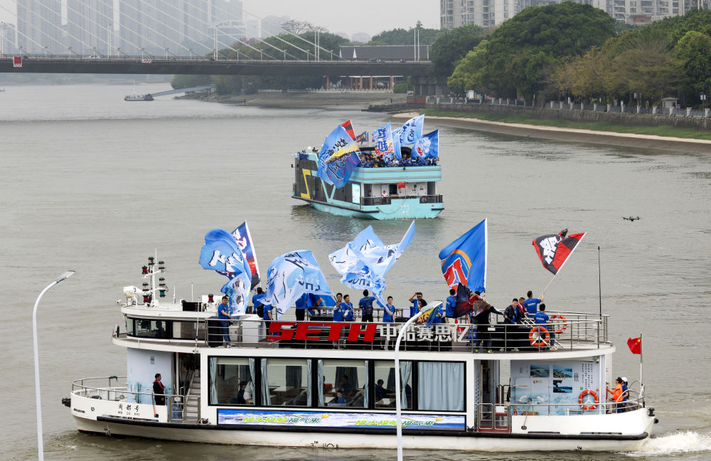 4月11日,“闽超”福州队球迷在闽江游船上活动。新华社记者 魏培全 摄