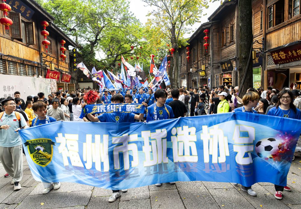 在三坊七巷,来自福建三明的游客王文利带着母亲和孩子游玩。“之前看到过‘闽超’的消息,今天的巡游很吸引眼球,远处看到挥舞的旗帜,听到鼓声、歌声和呐喊声。三明队也在集训备战,希望他们能取得好成绩。”