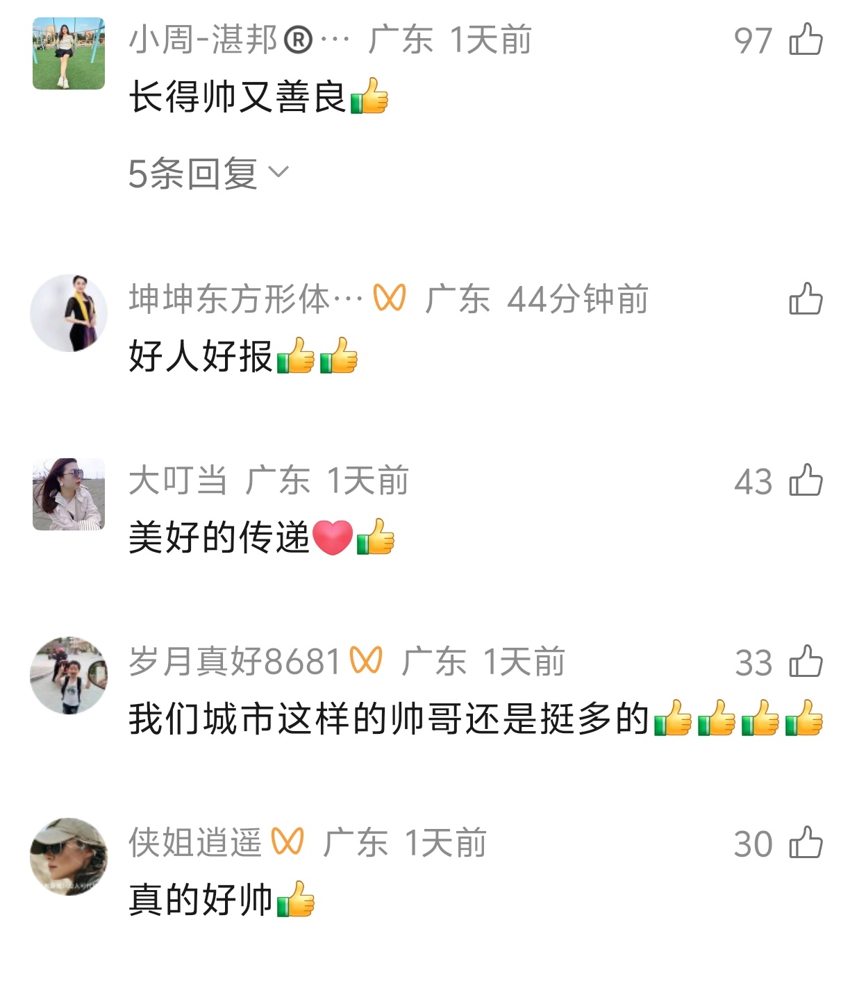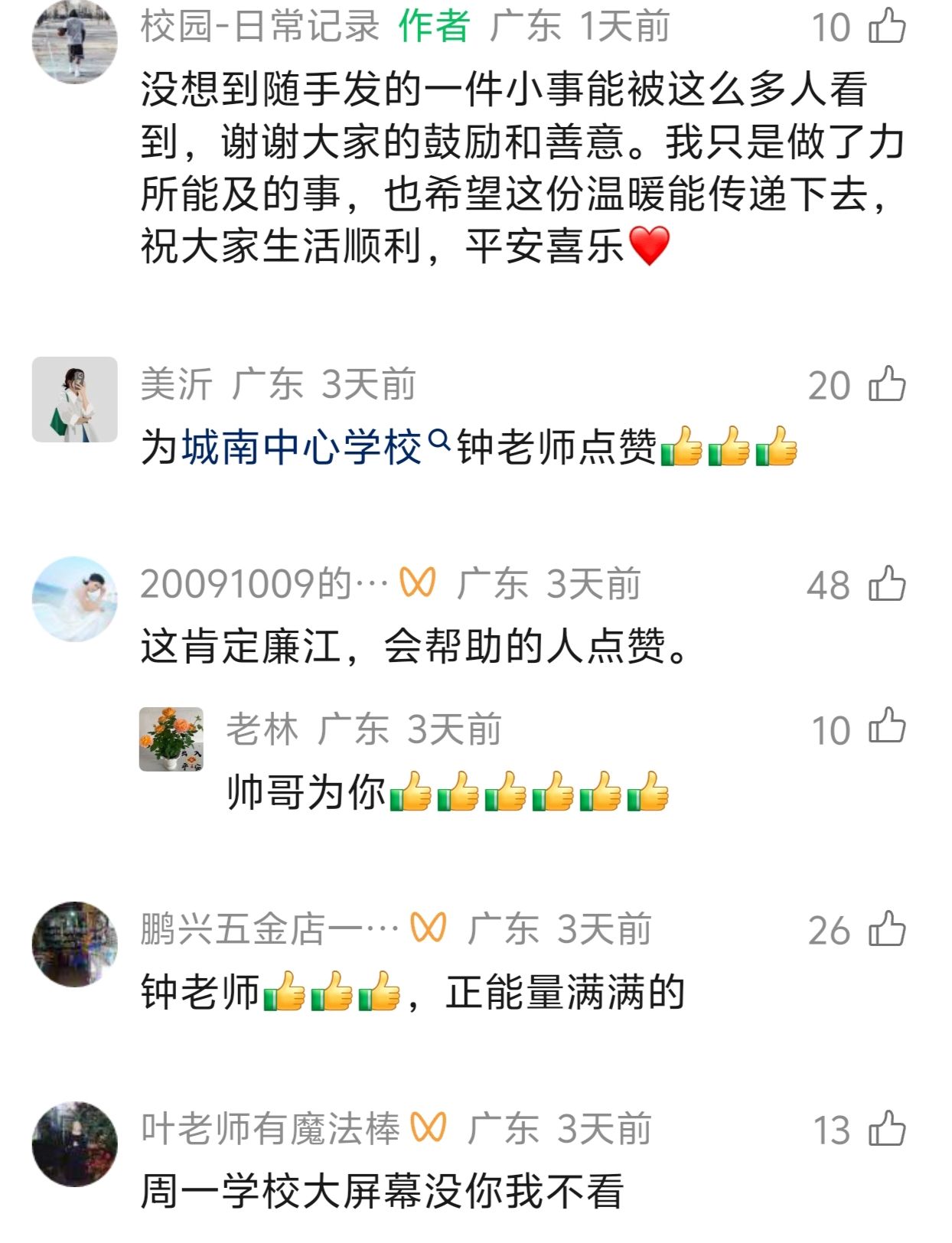 回忆事发经过,钟石清说,当时路口车流量大,阿姨长时间停留极易发生危险,他便上前顺手一推,帮车辆顺利驶离路口。这一幕被刚和他打完排球的同事拍了下来,视频发布后迅速走红,获新华社、湛江日报转发报道,网友评论连连点赞:“这一刻你是最靓的仔!”“举手之劳的温柔,就足够让人心头一热、热泪盈眶”“善良发自内心和骨子里的,帅哥的举动温暖了这座城。”