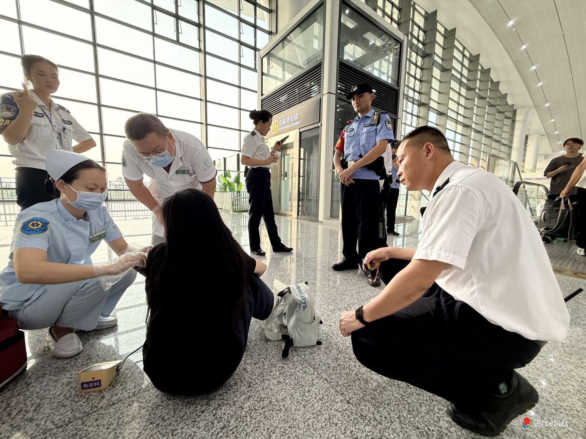 等待救护车期间,工作人员始终保持冷静,并未盲目搬动旅客,而是在确认现场环境安全的情况下将其转移至安全区域。同时,他们还俯身关切询问旅客身体状况、耐心安抚情绪、收集其病史信息,为后续赶来的医护人员提供了重要诊断线索。
