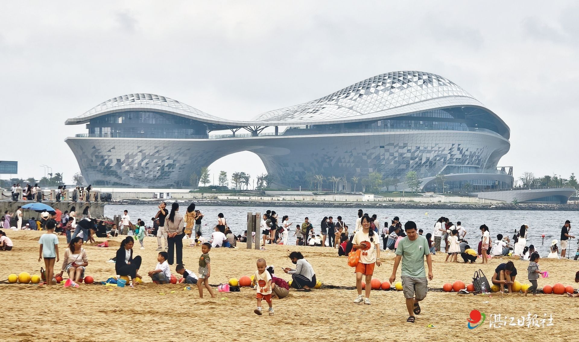 市民游客在市区金沙湾游玩,远处建筑为湛江文化中心。