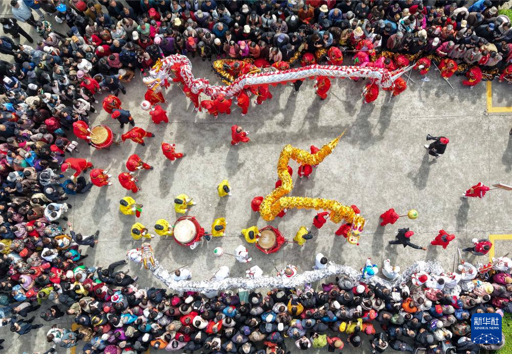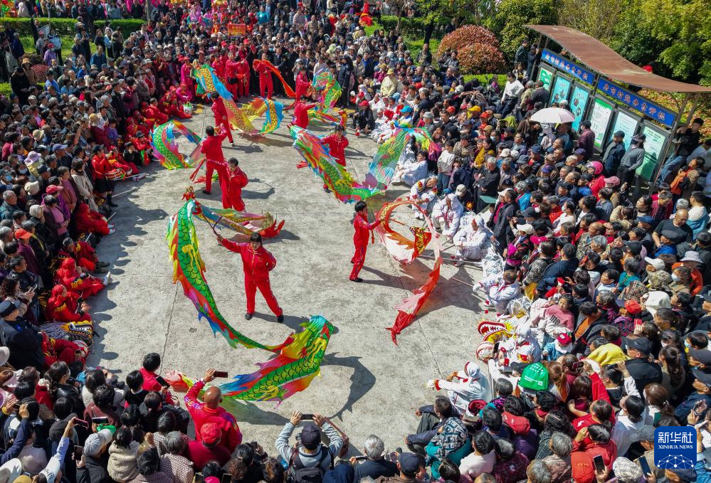 4月19日,村民在江苏省泰州市海陵区唐甸村“三月三”传统庙会上进行舞龙表演(无人机照片)。当日是农历三月初三,不少地方举行丰富多彩的民俗活动,欢度“三月三”传统节日。新华社发(汤德宏 摄)
