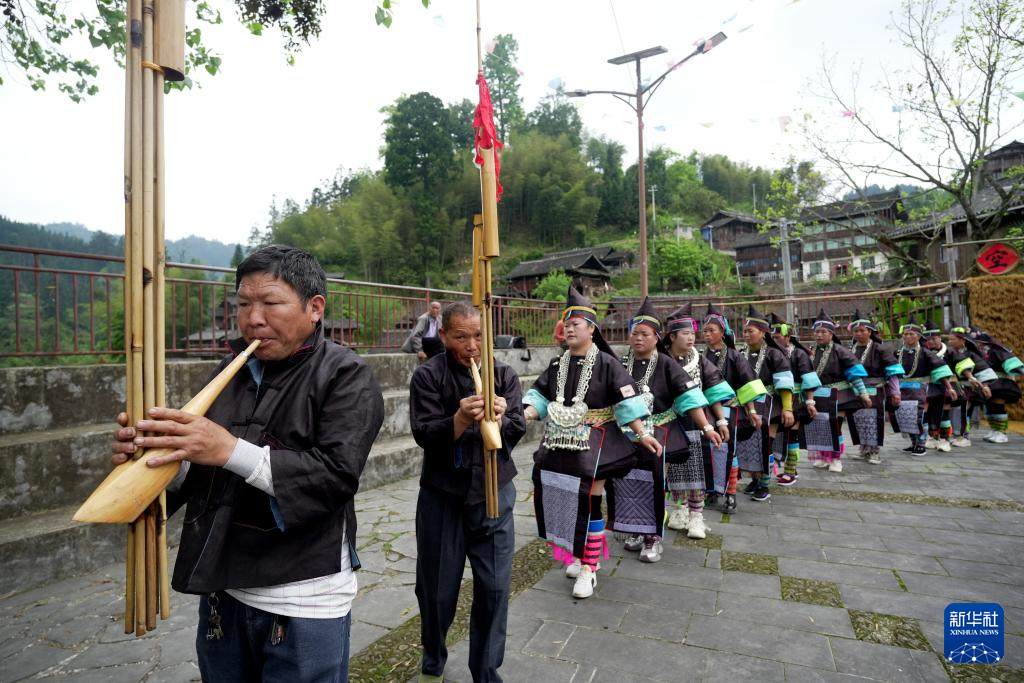 4月19日,在贵州省榕江县两汪乡空申苗寨,苗族群众跳芦笙舞欢度“三月三”。当日是农历三月初三,不少地方举行丰富多彩的民俗活动,欢度“三月三”传统节日。新华社发(王炳真 摄)