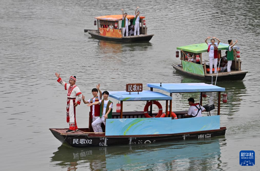 4月19日,2026年“广西三月三·八桂嘉年华”文化旅游品牌活动继续在南宁市民歌湖举行,演员乘坐游船在湖上表演。当日是农历三月初三,不少地方举行丰富多彩的民俗活动,欢度“三月三”传统节日。新华社记者 陆波岸 摄