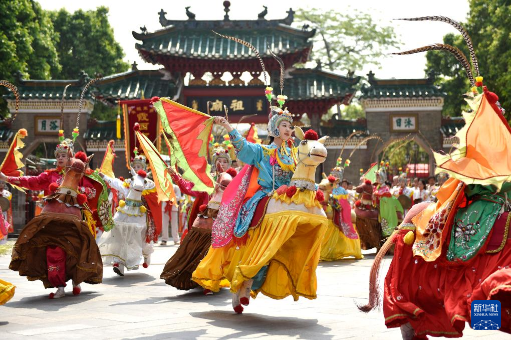 这是4月19日在广东佛山祖庙北帝诞春祭大典上拍摄的民俗表演“潮州布马舞”。当日是农历三月初三,不少地方举行丰富多彩的民俗活动,欢度“三月三”传统节日。新华社发(訚洪 摄)