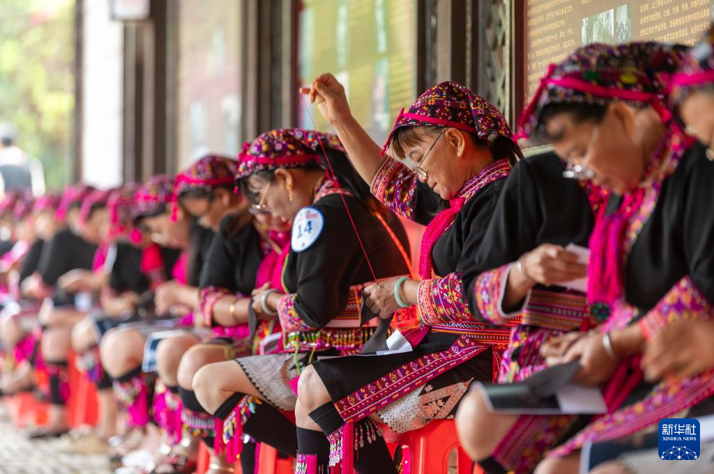 4月19日,海南省琼海市会山镇的苗族妇女在“三月三”活动上参加苗绣比赛。当日是农历三月初三,不少地方举行丰富多彩的民俗活动,欢度“三月三”传统节日。新华社发(蒙钟德 摄)
