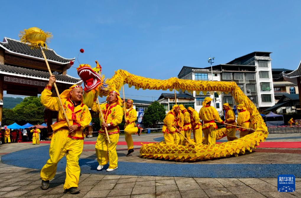 4月19日,在广西柳州市融安县板榄镇欢歌广场举行的“三月三”活动上,民间艺人表演舞龙。当日是农历三月初三,不少地方举行丰富多彩的民俗活动,欢度“三月三”传统节日。新华社发(谭克兴 摄)