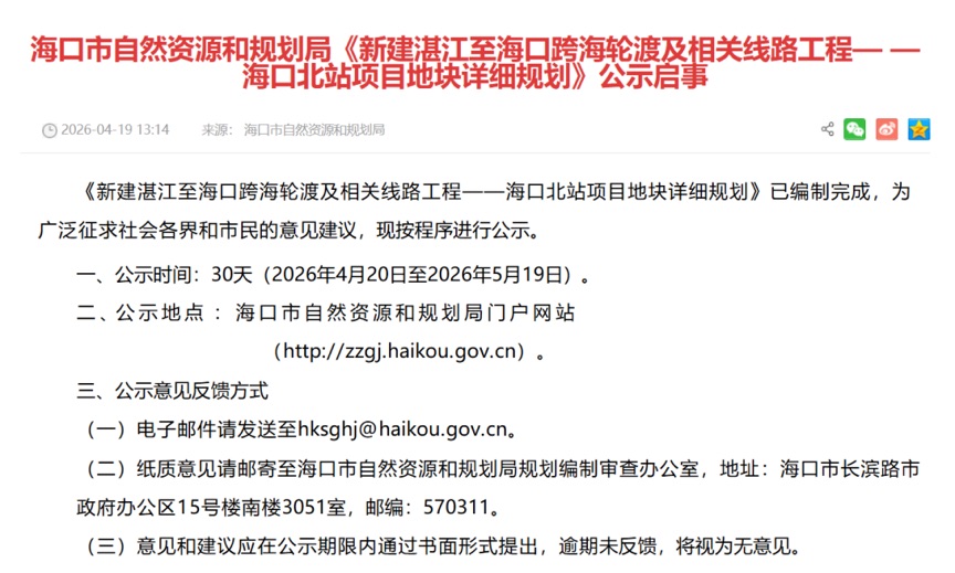 目前,项目规划公示期为2026年4月20日至5月19日,社会各界可通过官网、邮件、信函等方式建言献策。随着海口北站规划落地、广东段前期工作稳步推进,湛海跨海通道正从蓝图走向现实。
