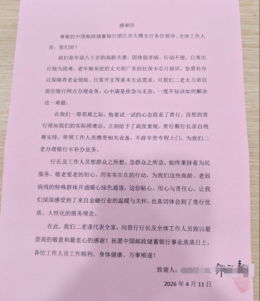 近日,邮储银行湛江市大楼支行收到了一封来自八旬高龄老人钟阿姨的感谢信。而这封感谢信的背后,是一段邮储银行用暖心服务为高龄老人排忧解难的动人故事。